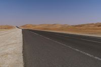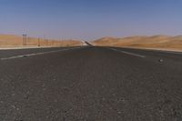 A straight highway stretches across the Liwa Desert in the United Arab Emirates, forming a line across the rugged terrain of the Badlands. With a clear sky, the road surface is a mix of asphalt, sand, and soil, providing a dramatic panorama of the early morning prairie.