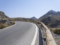 A winding road lined with Armco barriers and trees stretches through the Mallorca highlands in Spain, with a yellow line in the foreground. The mountain landscape in the Balearic Islands is filled with rock formations and mountain passes, giving a unique view of the natural geology.