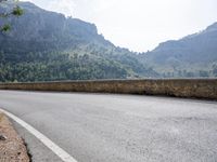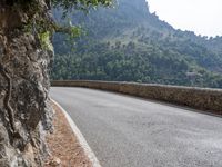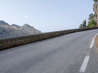A scenic overview of Spain's Balearic Islands, with a winding road through the coastal landscape, surrounded by mountains, ocean, grass, and trees, with a clear blue sky overhead. Infrastructure such as guard rails, Armco barriers, and road surfaces are visible, showing the highway's journey through the highlands, mountain range, and mountain landforms.