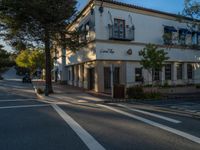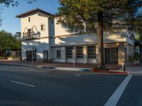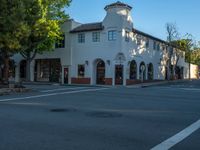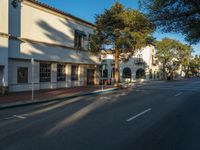 A beautiful tree lined street with historic architecture and storefronts on a clear day in the USA.
