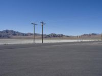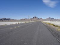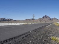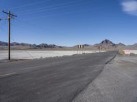 A view of the endless road of Utah, USA, cuts through the low desert and its mountain landforms. From the asphalt road surface to the plain tree line, this natural environment is crisscrossed with infrastructure, overhead power lines, and the Bonneville Speedway. The clear sky and the day's sunlight are perfect for this road trip to Salt Lake City.