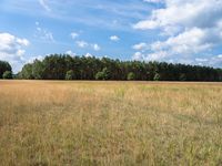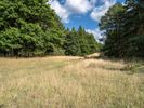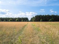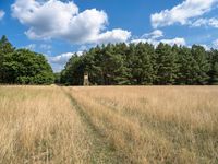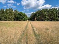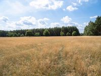 A lush landscape of trees, dirt roads, and fields of flowers in the countryside of Berlin, illuminated by cumulus clouds and sunlight.