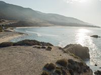 The sun shines brightly over the rocky shoreline of Loch Lomond, Scotland, creating a stunning landscape of open space, hills, sand and gravel. A promontory wall of rocks stretches along the beach and out into the sea, framing the bay and headland beyond.