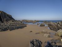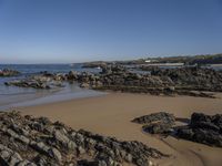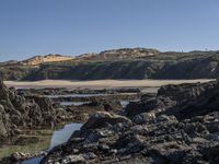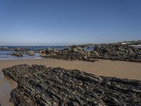A view of the rocky terrain of Portugal, along the coastal shore. A clear sky above the ocean reveals the landforms created by nature, including headlands, outcrops, and a mountain range in the distance. The day reveals a variety of natural environments, including beaches, sand, bedrock, and grass, as well as wood and water resources.