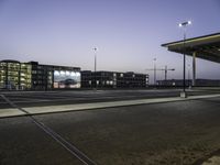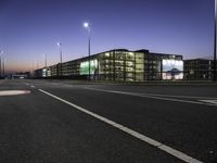 The asphalt road surface winds through the metropolitan area, dotted with street lights, parking lots, and bridges, as the sky is lit with the shades of dawn. Urban infrastructure and public spaces, such as stadiums, transport hubs, and residential areas, strike a dynamic contrast with the rolling cloud horizon.