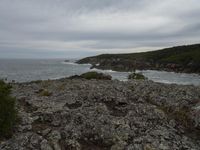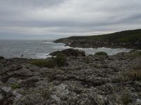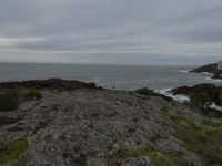 A gloomy and rugged coastal landscape in New South Wales, Australia, featuring cliffs, bedrock, and a grey sky overlooking the Sapphire Coast, near Kianinny Head and Tathra. The terrain is covered in grass and vegetation, with waves crashing against the beach and bank.