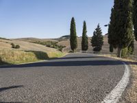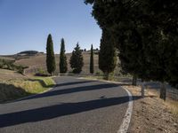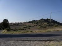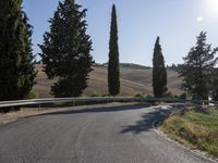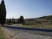 A winding, asphalt road stretches through a rugged landscape of hills, mountains, and low vegetation in the Tuscany region of Italy, beneath a sunny winter sky. A view of the natural environment reveals a clear roadside with Armco barriers, overhead power lines, and a variety of trees, shrubs, and woody plants, including cypress trees and a harvested garden. This thoroughfare provides a link between the wilderness and the infrastructure of the local area, creating a unique lot of land.