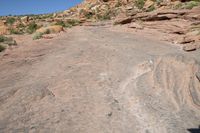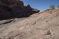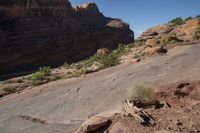 A scenic view of the rugged landscape in Canyonlands, Utah, showcasing the red rock formations and vegetation against a clear sky.