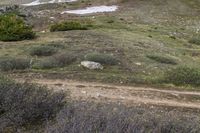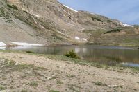 A magnificent view of the rugged landscape in Loveland Pass, Colorado, USA. The image showcases the diverse vegetation, rocky bedrock, and sloping terrain. The grass and groundcover create a beautiful surface, while the formation and outcrop add to the natural beauty. The picture was taken during the day, highlighting the elevated gravel road that winds through the high mountains. The snow-capped peaks and fluffy clouds enhance the highland atmosphere. This image perfectly captures the plant community and natural environment of this alpine region, with a watercourse and a tree-lined lake providing a refreshing touch. The fluvial landforms of streams, along with the glacial banks and mountain range, create a stunning geological phenomenon. The straight road leads the eye to a vast field surrounded by a picturesque valley.