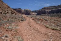 Scenic view of a brown bedrock formation in a valley, surrounded by red rock mountains and clear sky in the Canyonlands of Utah, USA.