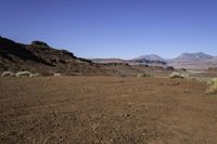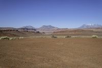 Scenic view of a rugged landscape in Utah, USA, featuring red rock formations, mountains, and open spaces.