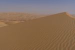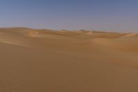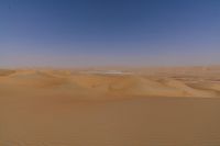 The Liwa Desert in the United Arab Emirates is an expansive plain with a clear sky, offering a rugged atmosphere and open space. The surface is dotted with sand dunes and ergs, shaped by the aeolian landforms. At dawn, the desert's singing sand can be heard as the off-road track leads to the horizon.