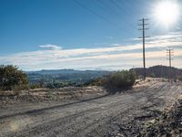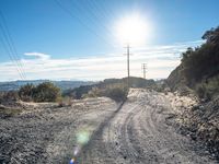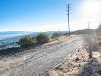 A bike rider takes a challenging ride down a steep, dirt road in Los Angeles, California. The morning sun shines brightly over the rugged landscape, providing an elevated view of the rural landscape and city skyline in the distance.