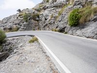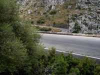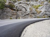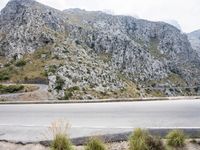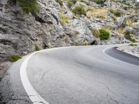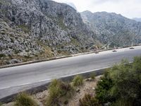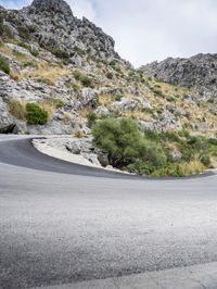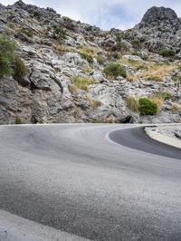 A winding road curves its way through the rugged terrain of the Balearic Islands in Spain. The mountains, ocean, and river are juxtaposed against the wild terrain of the land, featuring a mix of rock, grass, and vegetation. The elevated highway offers a sweeping view of this unique landscape, where the ocean meets the shore, and the mountain range meets the lowlands.