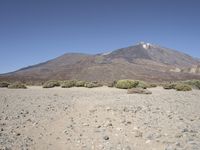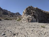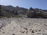 A dirt track winds through a rugged landscape of mountains, valleys, and badlands in Spain's Tenerife, Europe, with the clear sky of the natural environment above and the desert sand and soil below.