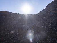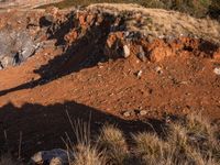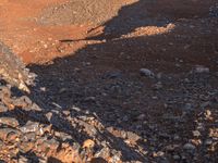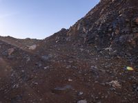 A winding and rugged road made of dirt and gravel, surrounded by a wild landscape of mountain landforms, badlands, stone walls, and tree-covered hills, in the Yunnan Province of China. With an open sky of clouds and sunlight, this rocky terrain displays a Mars-like, top-down view of the soil and bedrock formations, and a lava-filled volcanic wadi in the foreground.