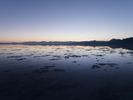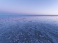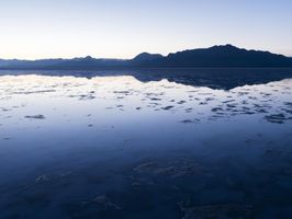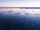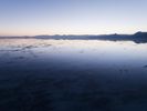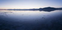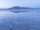 A breathtaking winter day in Salt Lake City, Utah, USA, featuring the spectacular reflection of a rugged salt lake in the wet desert. The still and calm atmosphere provides a perfect view of the stunning horizon, with blue sky, white clouds, and the ocean and mountain in the distance.