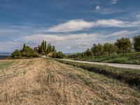 A gravel road winds through the rugged landscape of Tuscany, Italy, on a clear summer day. The nearby harvest garden and cypress trees showcase the beauty of the rural, natural landscape.