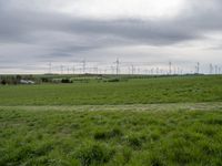 A lush green field in Berlin, Germany, with a windmill and a winding path stretching straight down the road, showcasing the rural charm of Europe.