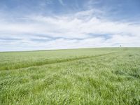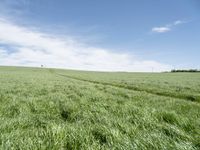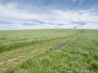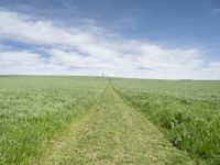 A lush landscape of nature, agriculture, and modern architecture in Europe, Germany. A windmill, wind turbine, sculpture, and container are scattered across the field and grass surface, surrounded by a clear sky. The path leads straight down the road, with a mirror-like reflection in a mill, creating a peaceful rural village profile.