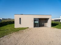 A view of a rural Dutch landscape with a modern villa, featuring a combination of concrete, grass and asphalt surfaces, a building with a facade, windows, siding, and a roof, a tree providing shade, vegetation, and a land lot with an open space.