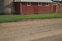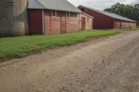 A real estate property in Bancroft, Iowa, USA featuring a house, shed, barn, and other structures with a gravel driveway, grass lawn, dirt and sand fields, and a grey sky above. The property's infrastructure is surrounded by open space, vegetation, and a prairie with a straight road down the middle, providing a profile view of the home.