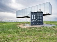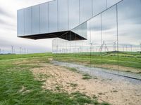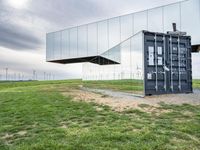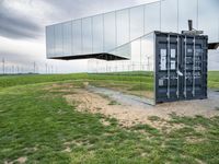 A composite material fence encloses a rural landscape in Berlin, Germany. The field is dotted with a house, windmill, tree, and a sculpture, all beneath a cumulus cloud-filled sky and a horizon of rolling hills and a rectangled gas pole. Natural vegetation and a prairie-like groundcover cover the land lot, while a path and asphalt road offer access to it and a billboard adds a bit of urban design. Sunlight illuminates the open space and a door on the facade of the house. Solar panels capture the solar energy around them.