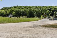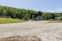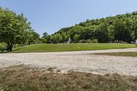 A scenic rural landscape with a lush green field and trees, showcasing the natural environment in a peaceful countryside