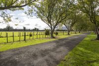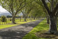 A beautiful rural landscape with lush green vegetation and a clear blue sky. The road surface leads straight ahead, surrounded by trees and branches. The sunlight casts a gentle shade on the grass surface, creating a serene and peaceful atmosphere.