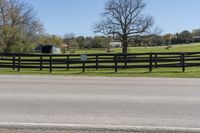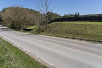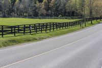 A scenic view of the Ontario countryside with lush green fields, a split-rail fence, and a straight road leading into the distance.
