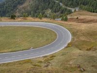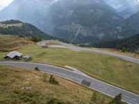 An aerial view of the winding asphalt road below with an Armco barrier in the foreground and the rural landscape of Austria in the background, featuring a guard rail, switchback curves, and open spaces full of clouds and mountains, providing an elevated overview of the beautiful nature of Europe on a sunny day.