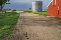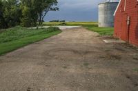 A view of a rural road in Bancroft, Iowa, USA on a cloudy day. The road surface includes a mix of dirt, gravel, soil, grass, asphalt, and a driveway leading to a house. The open space of the prairie land lot includes a shed and barn, along with agriculture-based fields and farms.