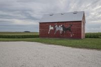 View of a rural landscape and gravel road in Bancroft, Iowa, USA. The scene includes a house, shed, pasture, and open fields with dirt and grass surfaces under a grey sky.