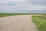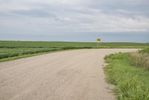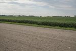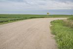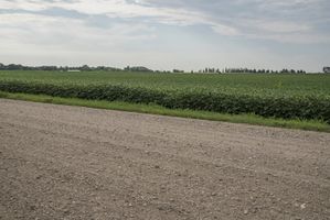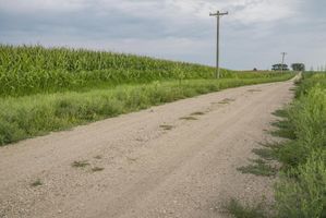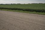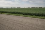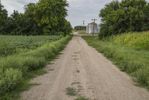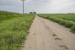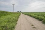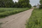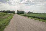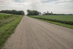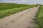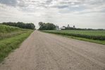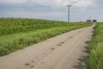 A road with a mix of dirt, gravel, and asphalt winds through a rural landscape of tree-lined fields and farms near Bancroft, Iowa, on a grey day. Infrastructure and agriculture coexist in this location, with a road surface providing a path for vehicles and crops growing in the surrounding fields.