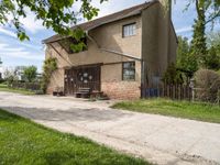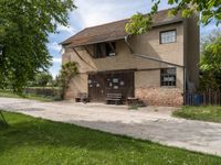 A rural road, lined with gravel and lush green nature, leads straight down the road to a barn and house in the German countryside. The clear sky and concrete street profile a peaceful day on the farm.