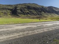 an empty road between two mountains in the far distance, with a fence and a green grass hill