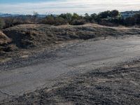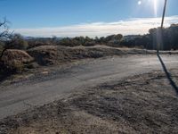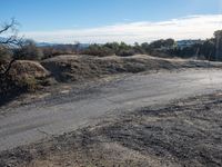A winding road in the Los Angeles area of California, USA, is visible with an Armco barrier situated on a low point against a backdrop of mountains and a clear blue sky dotted with contrails.