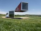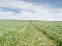 A winding road leads straight to a windmill in a lush green field in rural Germany, allowing a glimpse of the natural beauty and open space of the European landscape.