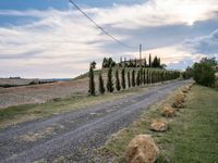 A rugged dirt road stretches straight down the landscape, surrounded by cypress trees and rolling hills in rural Tuscany, Italy. The harvest season and natural beauty of the European garden can be seen through the clouds in the blue sky.
