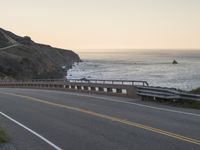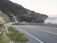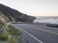A winding road curves through the mountainous terrain of California's Big Sur, with the ocean and clear sky in the horizon. The Armco barrier, shore, and trees provide a contrast to the asphalt highway, which provides a thoroughfare for travelers along the Pacific Coast Highway.
