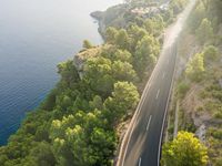 A top down aerial view of an S-curved road meandering through Mallorca, an island of the Balearic Islands in Spain. The coastal landscape is surrounded by the Mediterranean ocean, with a clear sky and a high vantage point providing an elevated view of the day.