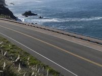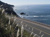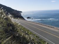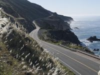 A car drives along the S-Curve on the Pacific Coast Highway in Big Sur, California, USA, with the Armco barrier providing a guard rail against the beautiful landscape of the coastline, cliffs and mountains in the background. The clear sky and sunshine provide a perfect backdrop to this amazing coastal vacation.