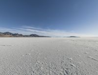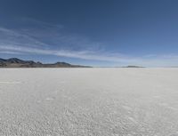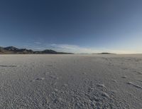 The azure afterglow of a winter evening reflects off the black asphalt of the Bonneville Speedway in Utah, USA, providing an emotional view of the salt lake, mountain range, and wild wilderness of the Saharan desert.