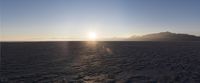 The sun rises over the open landscape of Utah, USA, its rays illuminating the salt lake, desert, mountains, and ocean in the distance. Nature and sunlight come together to create a beautiful, calm, and clear morning sky.
