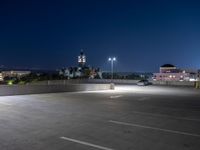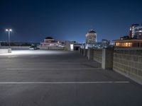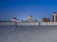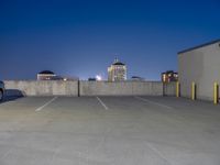 A cityscape of Salt Lake City, USA, illuminated by artificial light at the break of day. The modern architecture of an office building and parking deck are visible in the background, with a concrete street leading straight down the road.
