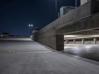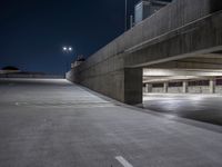 A view of a modern office building in the business district of Salt Lake City, USA, illuminated by artificial light. A concrete street, parking garage, and rooftop are visible straight down the road.