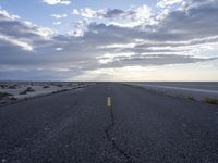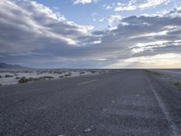 The endless road stretches straight down the road in the dramatic morning atmosphere of Utah. The natural environment of the yellow sand and blue ocean of the Bonneville Speedway is surrounded by the mountain landforms, highlands, and mountain ranges. The sun rises over the horizon of the tundra, beach, and shore, with a tree in the foreground and the clouds above, painting the natural landscape of the USA.