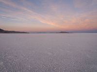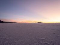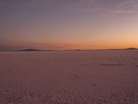 The night sky in Salt Lake City, Utah, USA is illuminated by a clear sky, dark desert, and sand surface at dawn, with a mountain range and contrails in the background at the Bonneville Speedway.