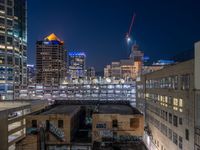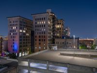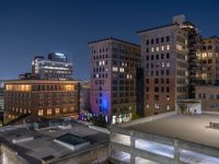 From a high position, an elevated view of the city of Salt Lake City, Utah, USA is revealed. Artificial light illuminates the modern architecture, concrete street and parking deck of the business district.