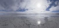The calm atmosphere and winter sunlight reflects off the waters of Salt Lake City, Utah, USA. The snow-capped mountains and cumulus clouds in the distance create a stunning landscape of the natural environment of the highland.